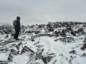 Na een uur vanuit het kamp richting de gletsjer geklommen en een kijkje genomen bij het gletsjer meer. Terug begint het licht te sneeuwen en moeten de regenjassen aan...